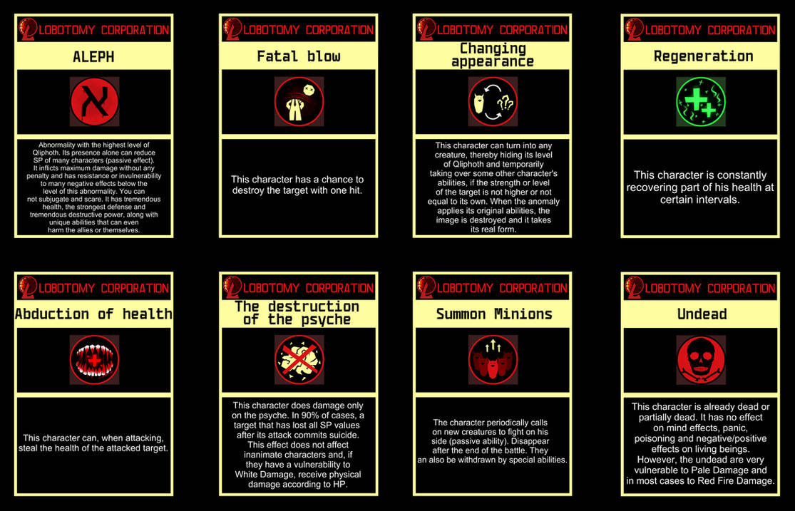 Название Lobotomy Corporation Автор ProjectMoon Класс сил Неопределённый Уровень сильнейшего объекта Неопределённый Канон Игры, новелла, комикс Жанры Стратегия и менеджмент для Lobotomy Corporation, карточная игра для Library of Ruina · Risk Level ALEPH Description One of the new ALEPHs being added into game, although being considered as 'The Weakest ALEPH' in the game currently, he is still pretty darn strong Basically, he escapes when left in a good or bad mood for some time, but is really easy to manage As his mood start at neutral, which is only the stage where he actually produce (a lotI'm also down to do sprite edits of the Lobotomy Corporation sephirahs, including Angela!